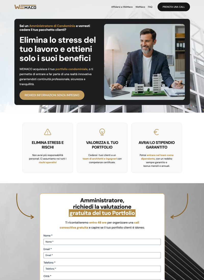 NON siamo una web agency o un’agenzia di social media marketing. La nostra specializzazione è realizzare landing page che portino gli utenti interessati alla tua proposta, ma che ancora non la conoscono, a interagire con la tua azienda in modo che tu diventi per loro la migliore soluzione al loro problema. Non vendiamo pagine web classiche o marketing tradizionale, ma una soluzione a un tuo problema, quello di trovare nuovi clienti realmente interessati alla tua proposta.